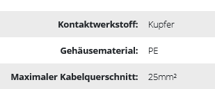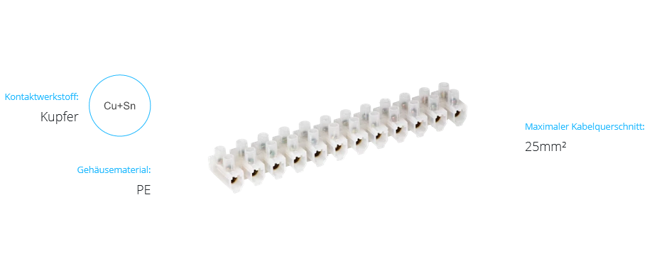 Die ECO-Klemmenleiste wird zur Herstellung von elektrischen Kabelverbindungen in Installationsdosen, Schaltschränken und Schalttafeln verwendet. Die Klemmenleiste hat 12 Anschlussstellen, die nach Bedarf abgeschnitten und in kürzere Abschnitte unterteilt werden können. Der Anschluss erfolgt über eine Gewindeklemme, die sich im Inneren des Gehäuses befindet. Dieses Modell der Klemme ist für den Anschluss von Leitern mit einem Querschnitt von max. 25mm2. Das Produkt wird aus Polyethylen hergestellt, das sich durch hervorragende elektrische Isolationseigenschaften auszeichnet, weiß