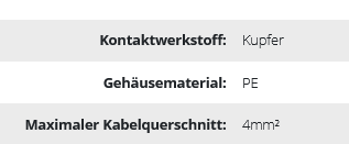 Die ECO-Klemmleiste wird zur Herstellung von elektrischen Kabelverbindungen in Installationsdosen, Schaltschränken und Schalttafeln verwendet. Die Klemmenleiste hat 12 Anschlussbahnen, die nach Bedarf abgeschnitten und in kürzere Abschnitte unterteilt werden können. Der Anschluss erfolgt über eine Gewindeklemme, die sich im Inneren des Gehäuses befindet. Dieses Modell der Klemmenleiste ist für den Anschluss von Drähten von max. 4mm2. Das Produkt wird aus Polyethylen hergestellt, das sich durch hervorragende elektrische Isolationseigenschaften auszeichnet, weiß.