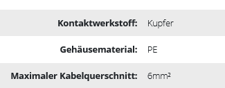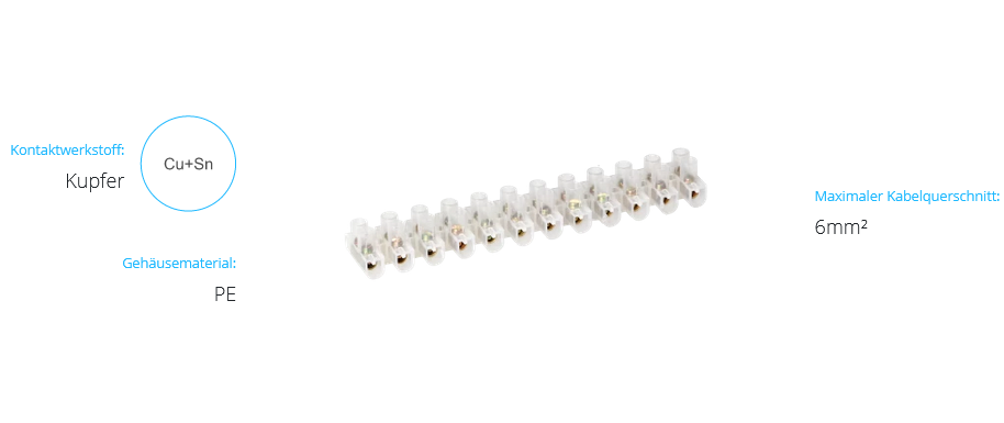 Die ECO-Klemmleiste wird zur Herstellung von elektrischen Kabelverbindungen in Installationsdosen, Schaltschränken und Schalttafeln verwendet. Die Klemmenleiste hat 12 Anschlussbahnen, die nach Bedarf abgeschnitten und in kürzere Abschnitte unterteilt werden können. Der Anschluss erfolgt über eine Gewindeklemme, die sich im Inneren des Gehäuses befindet. Dieses Modell der Klemmenleiste ist für den Anschluss von Drähten von max. 6mm2. Das Produkt wird aus Polyethylen hergestellt, das sich durch hervorragende elektrische Isolationseigenschaften auszeichnet, weiß.