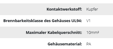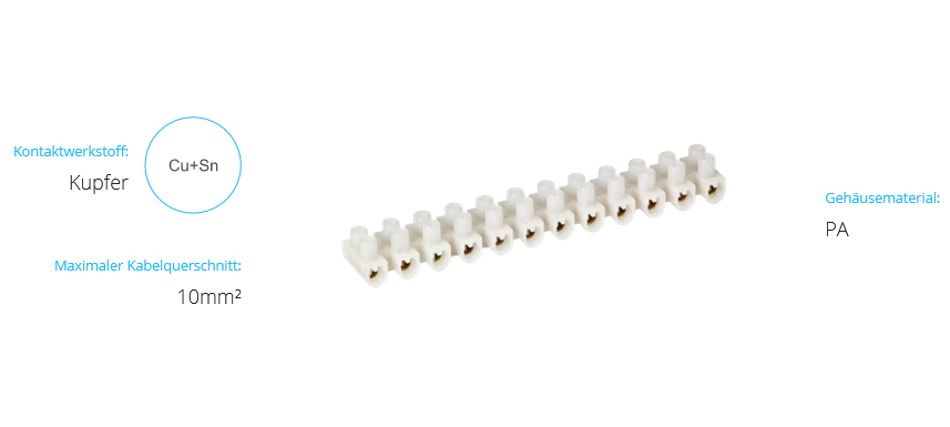Die PRO-Klemmenleiste wird zur Herstellung von elektrischen Kabelverbindungen in Installationsdosen, Schaltschränken und Schalttafeln verwendet. Die Klemmenleiste hat 12 Anschlussbahnen, die nach Bedarf abgeschnitten und in kürzere Abschnitte unterteilt werden können. Der Anschluss erfolgt über eine Gewindeklemme, die sich im Inneren des Gehäuses befindet. Dieses Modell der Klemme ist für den Anschluss von Leitern mit einem Querschnitt von max. 10mm2. Das Produkt ist aus schwer entflammbarem, selbstverlöschendem Material hergestellt, das der Brennbarkeitsklasse des Gehäuses - V1 - entspricht, weiß.