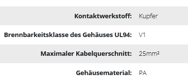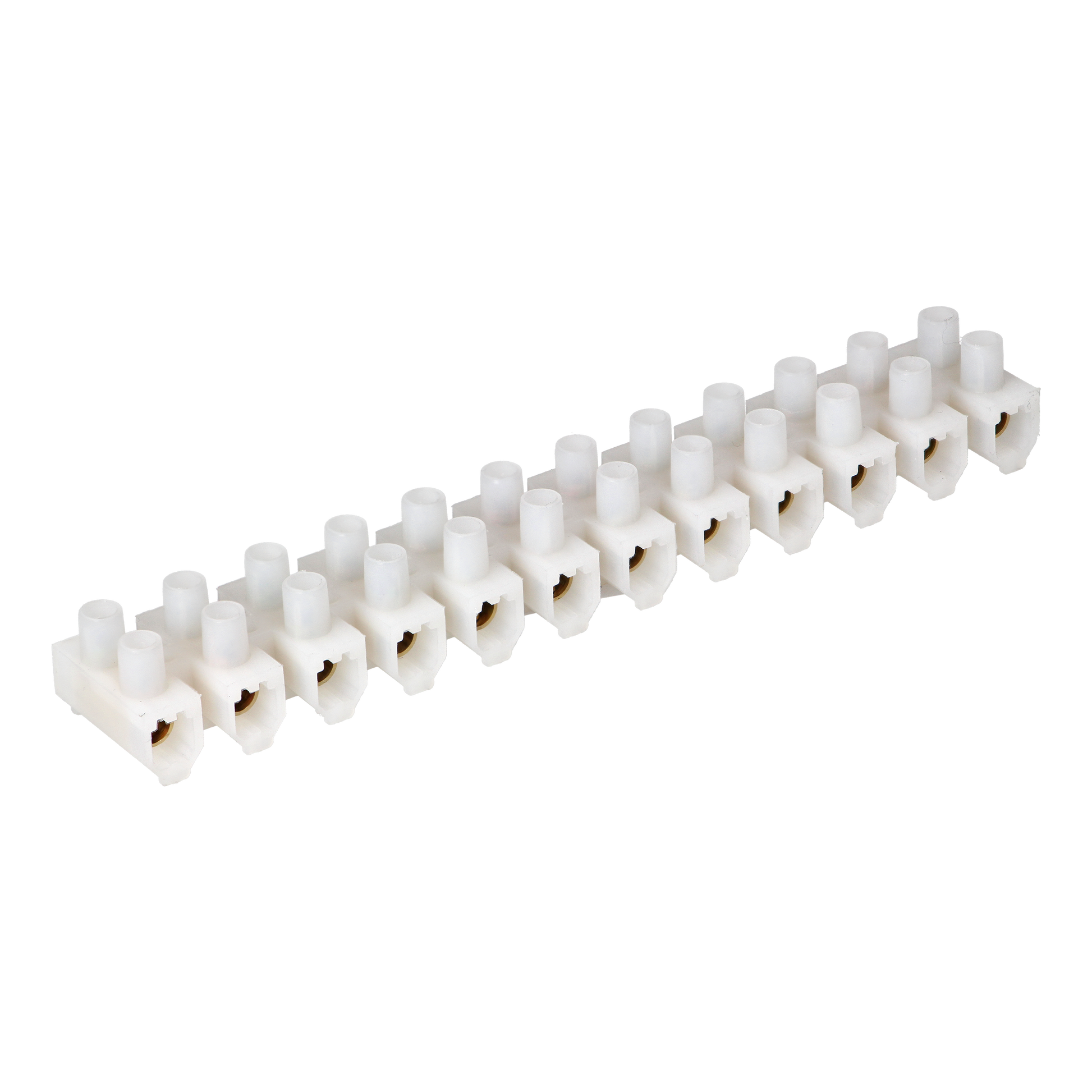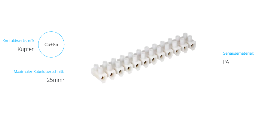 Die PRO-Klemmenleiste wird zur Herstellung von elektrischen Kabelverbindungen in Installationsdosen, Schaltschränken und Schalttafeln verwendet. Die Klemmenleiste hat 12 Anschlussstellen, die nach Bedarf abgeschnitten und in kürzere Abschnitte unterteilt werden können. Der Anschluss erfolgt über eine Gewindeklemme, die sich im Inneren des Gehäuses befindet. Dieses Modell der Klemme ist für den Anschluss von Leitern mit einem Querschnitt von max. 25mm2. Das Produkt ist aus schwer entflammbarem, selbstverlöschendem Material hergestellt, das der Brennbarkeitsklasse des Gehäuses - V1 - entspricht, weiß.
