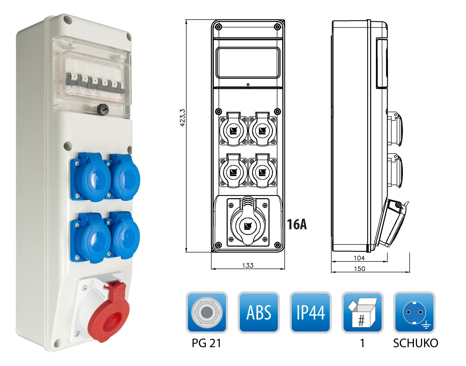 Baustromverteiler, Wandverteiler 4 x 230V/16A + 1 x CEE 16A/400V + LEGRAND LS
