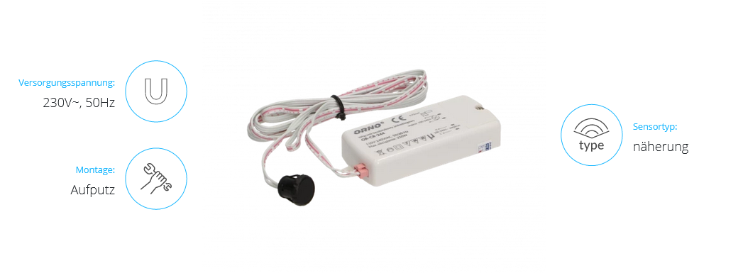 Der Sensor aktiviert den Stromkreis, wenn z. B. die Tür- oder Möbelfront vom Sensor in einem Abstand von ca. 5 cm wegbewegt wird. Das Ausschalten erfolgt, wenn wieder ein Hindernis im Sensorfeld erscheint. Das Gerät kann in Möbelschränken, Umkleidekabinen, Schiebeschränken, Lastkähnen usw. eingesetzt werden. Es arbeitet mit LED-Beleuchtung zusammen.