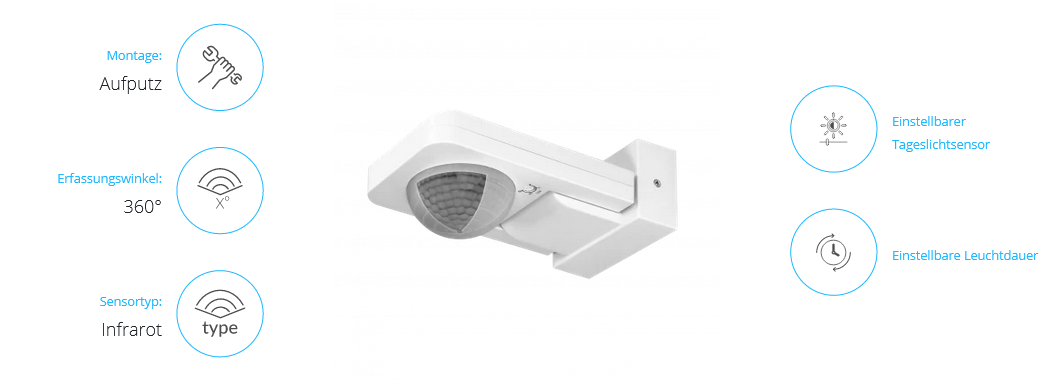 Der Sensor dient zur automatischen Steuerung von Beleuchtung oder anderen elektrischen Geräten.Ein dreifaches System von Sensoren mit Detektoren in einem speziellen Winkel ermöglicht die Kontrolle der gesamten Umgebung. Das Gerät eignet sich für den Einsatz in großen Räumen, z. B. Lagerhallen, Wartezimmer. Der Sensor zeichnet sich durch höhere Intelligenz und höhere Genauigkeit aus, wodurch auch kleinste Bewegungen erfasst werden können.Potentiometer zur Regelung: Beleuchtungszeit und Empfindlichkeit der Lichtintensität. Der Sensor arbeitet mit LED-Beleuchtung zusammen.