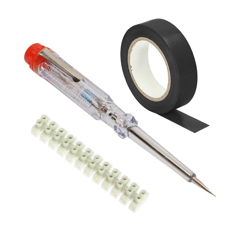 Ein Einbausatz, der aus einem Tester, d.h. einem Spannungsanzeiger von 100 bis 250 V, besteht, der eine Neon-Signaldiode, eine flache Stahlspitze und einen über die gesamte Länge isolierten Stift hat. Außerdem enthält das Set eine Klemmleiste aus Kunststoff, die ein einfaches Trennen der Leiterbahnen mit einem Messer ermöglicht, sowie ein flammhemmendes selbstklebendes Isolierband zur Verwendung als Isolator für elektrische Verbindungen.
