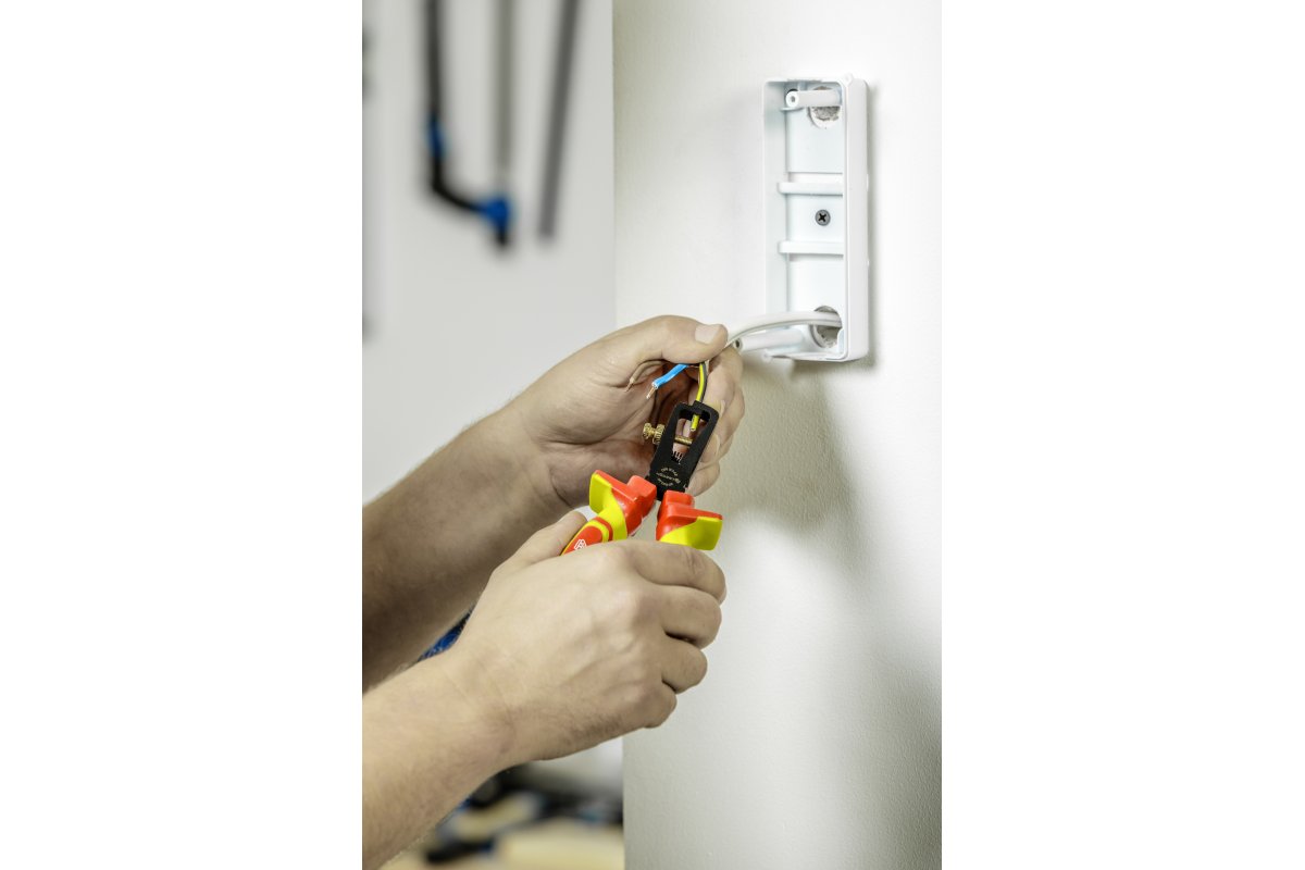 Verlängerte, gebogene Abisolierzange zum Schneiden und Formen von Leitungen und Draht. Zertifiziert für
