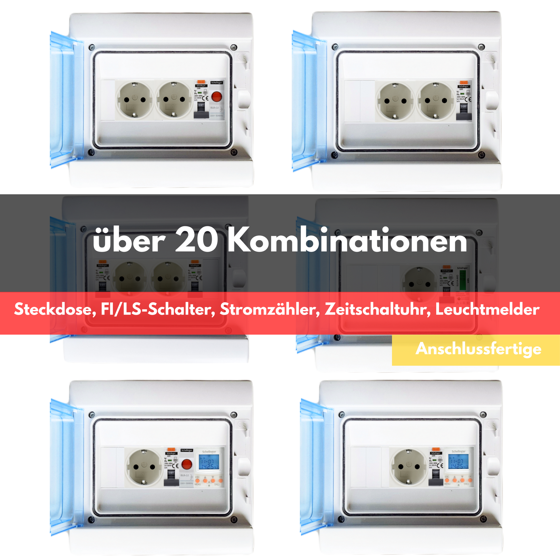 Steckdosen im IP65 Kleinverteiler mit Sicherungen (Steckdose, FI/LS-Schalter, Stromzähler, Zeitschaltuhr, Astrozeitschaltuhr, Leuchtmelder)