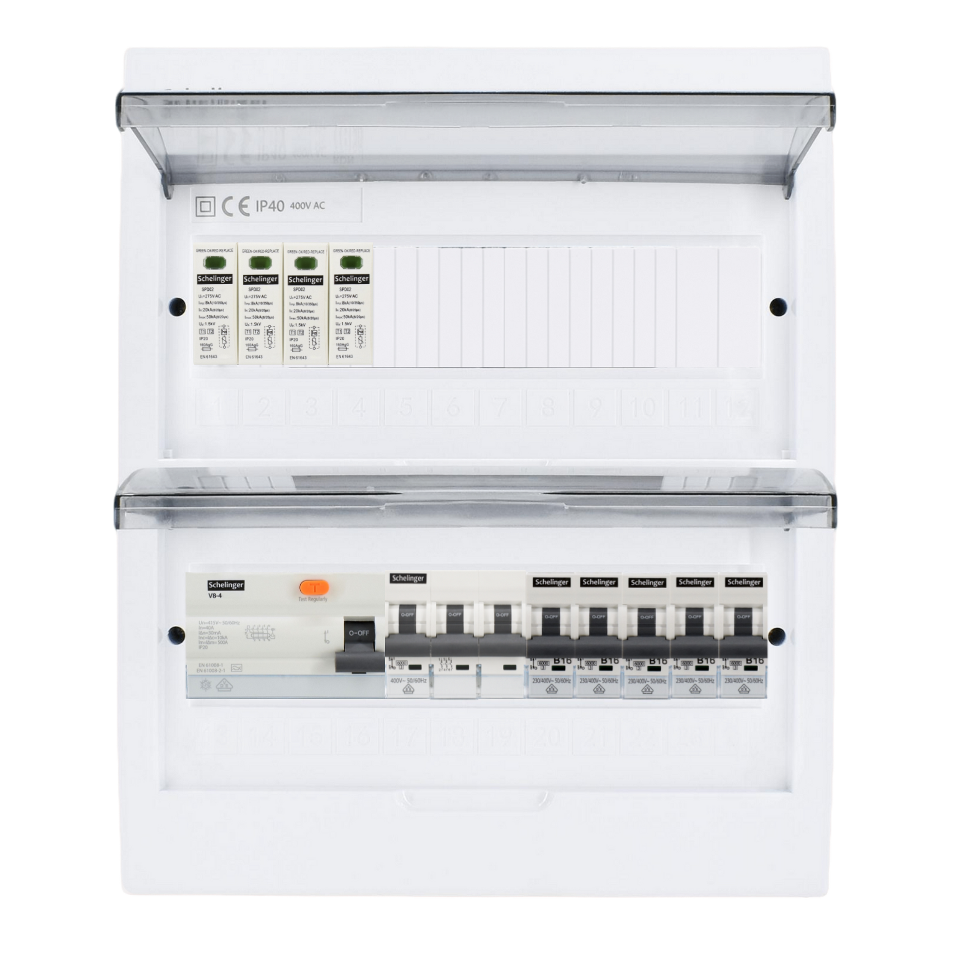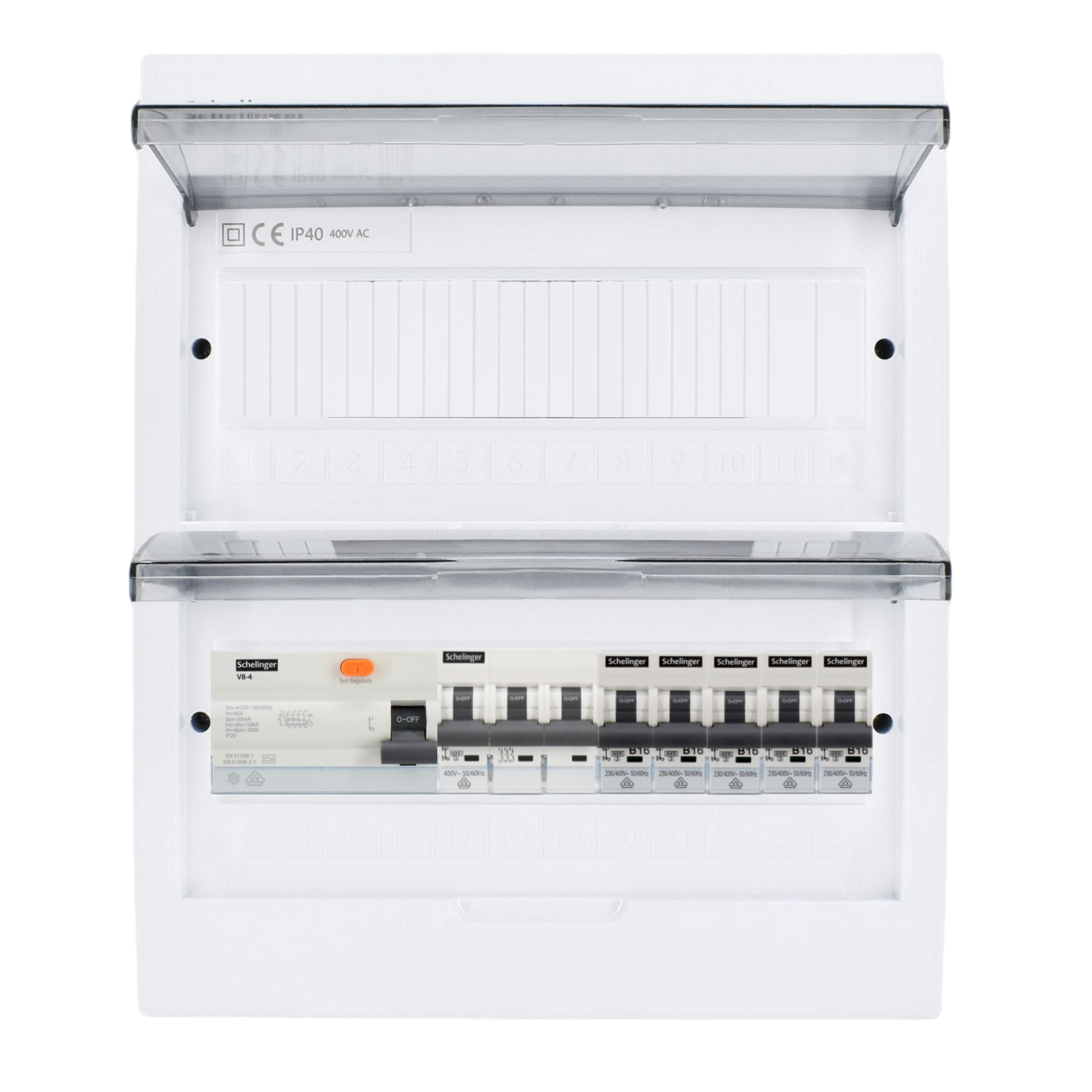 Sicherungskasten, 2,3,4,5 Reihig, Aufputz, Unterputz, Hohlwand, verdrahtet, VDE 1 x FI 40A/30mA + 1 x 3P LS B16 + 5 x 1P LS B16