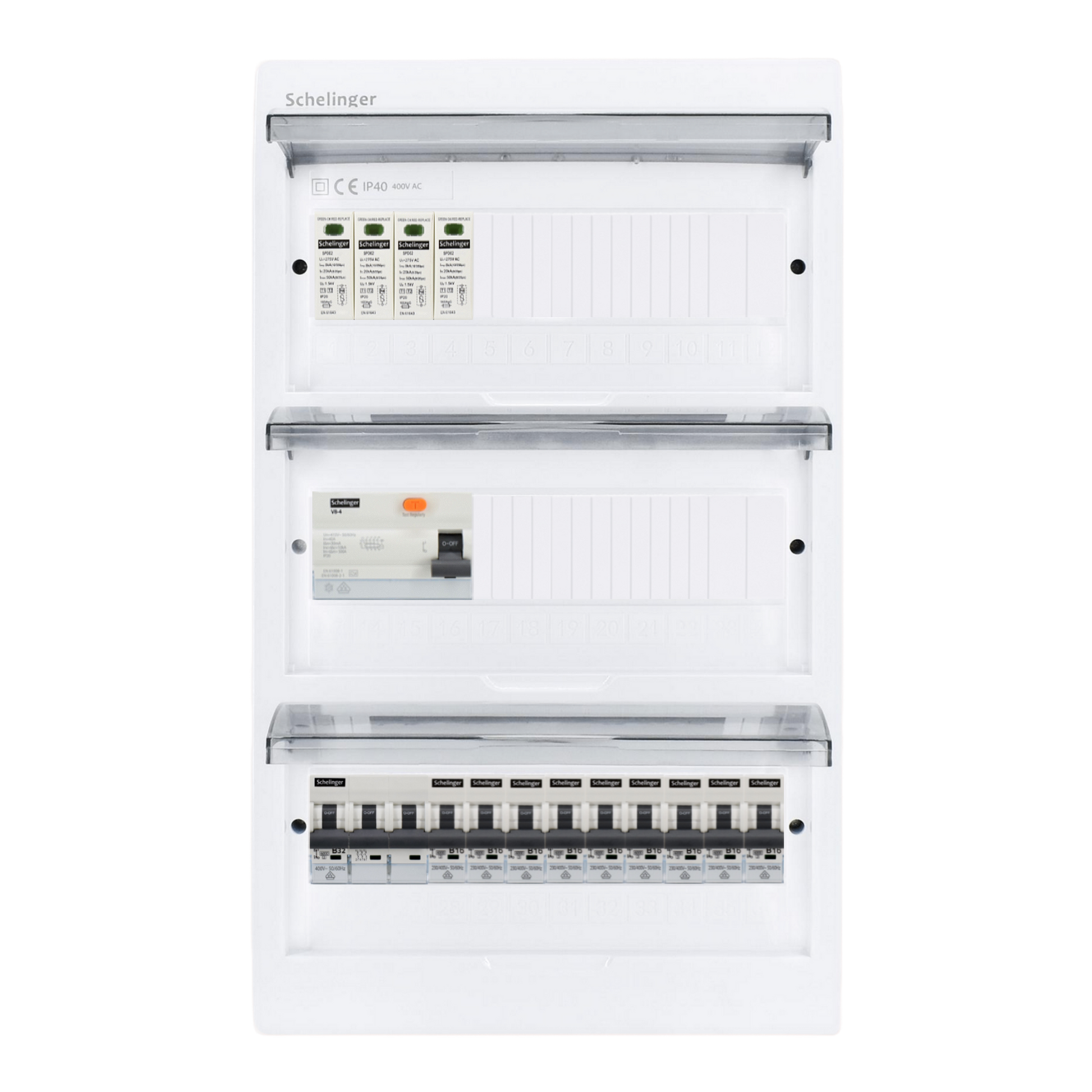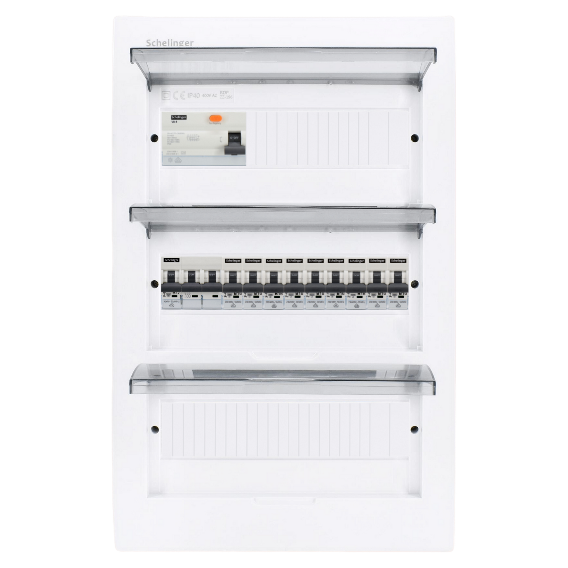 Sicherungskasten, 2,3,4,5 Reihig, Aufputz, Unterputz, Hohlwand, verdrahtet, VDE 1 x FI 40A/30mA + 1 x 3P LS B32 + 9 x 1P LS B16